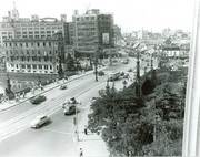 増上寺越しに建設中の東京タワーが見える。右は昭和電工。